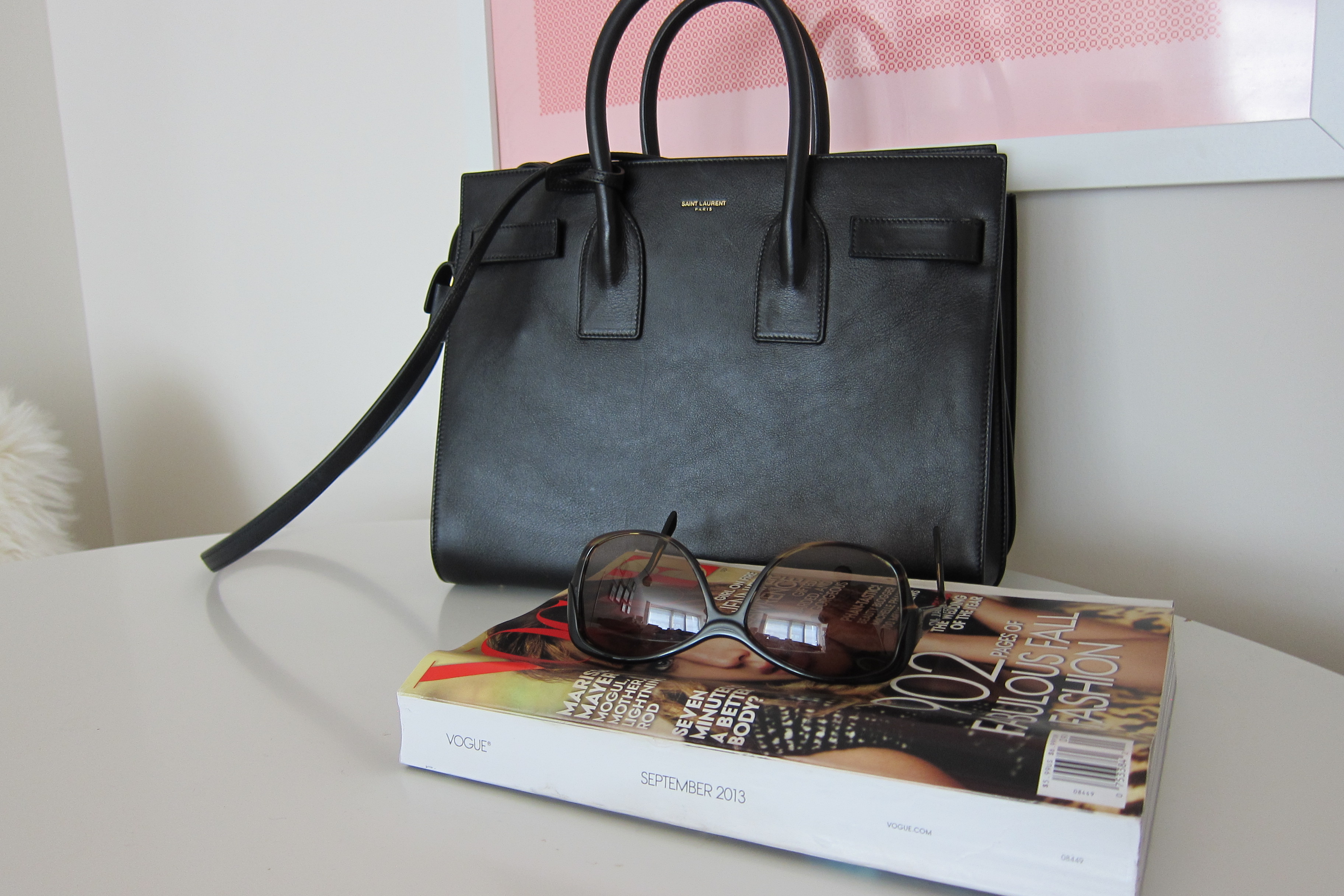 carrying my beautiful ysl sac de jour bag, reading the september issue of vogue, and wearing my oliver peoples sunglasses.