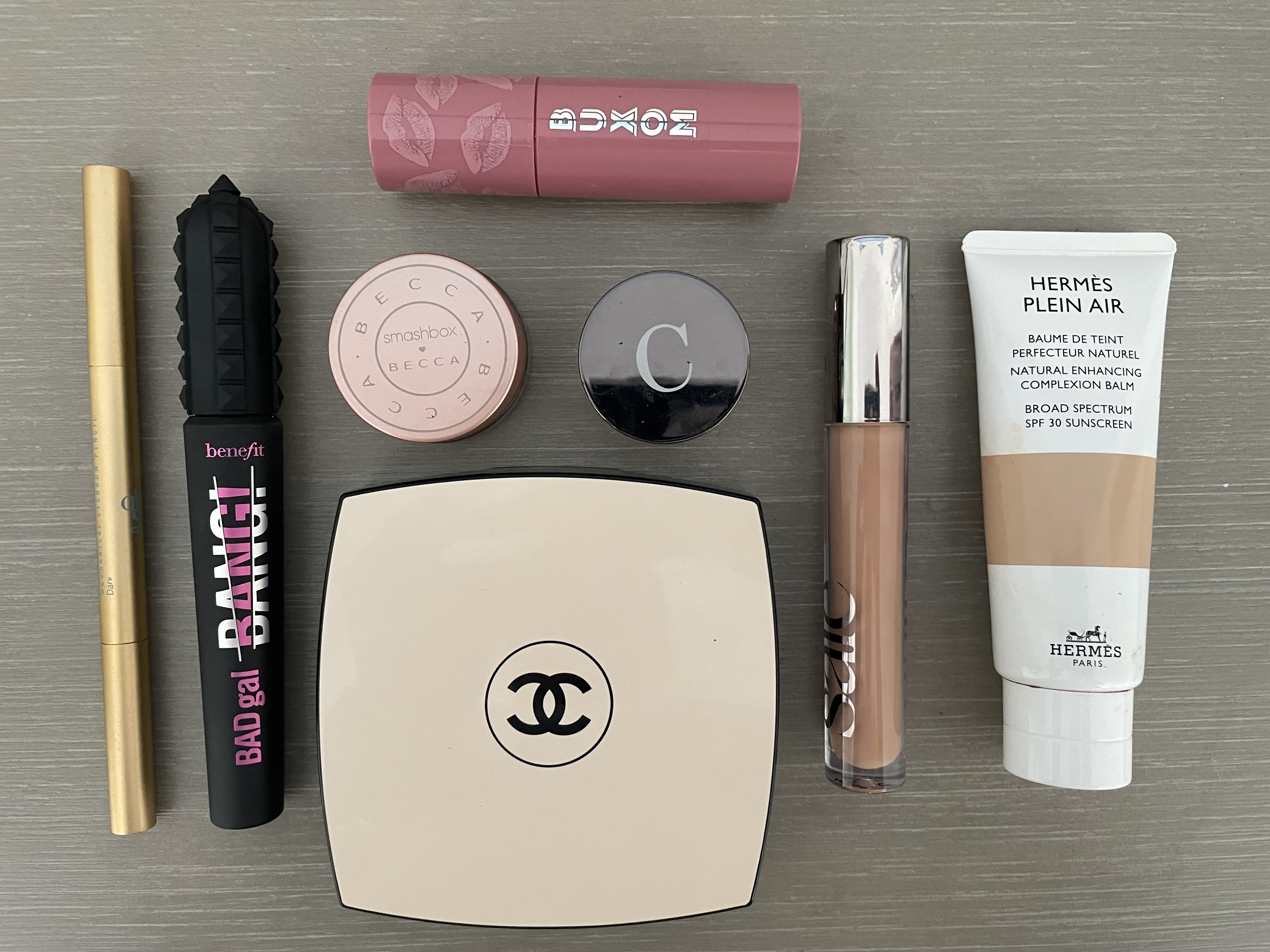 From left: Sania Brow Bar Eyebrow Pencil, Benefit Mascara, Buxom lip tint, Becca under eye corrector, Chantecaille eye shadow, Chanel palette (with bronzer, blush, and highlighter), Saie concealer, and Hermes tinted moisturizer. I know several of these are very expensive, but I expect them to last a long time.