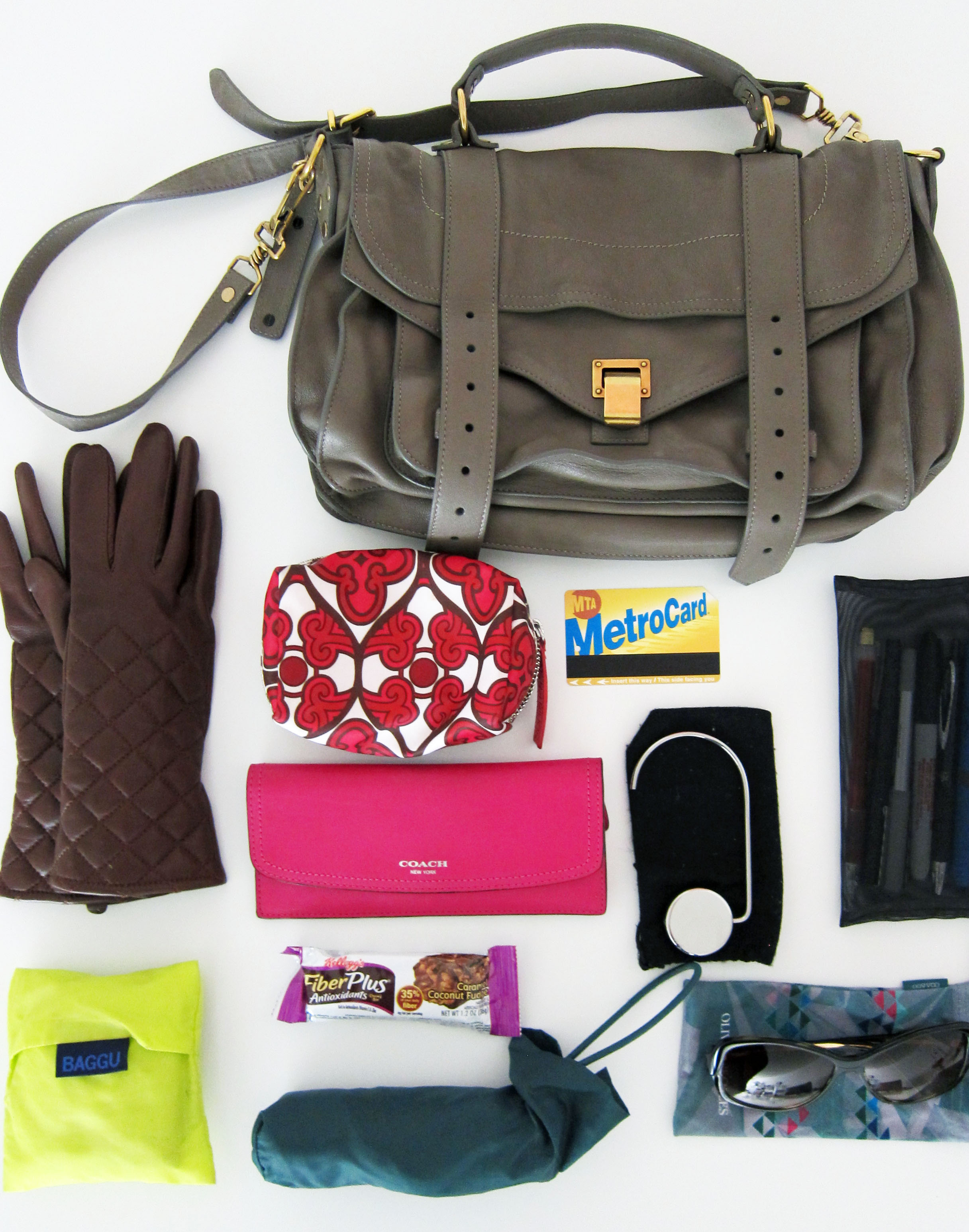 from top center: sonia kashuk for target make up case, metrocard, pencil pouch, oliver peoples sunglasses, mini umbrella, baggu (great for protecting your bag if you are caught in the rain!), quilted leather gloves from target. center: coach slim wallet (which will get its own post soon), bag hook, and fiber plus bar.